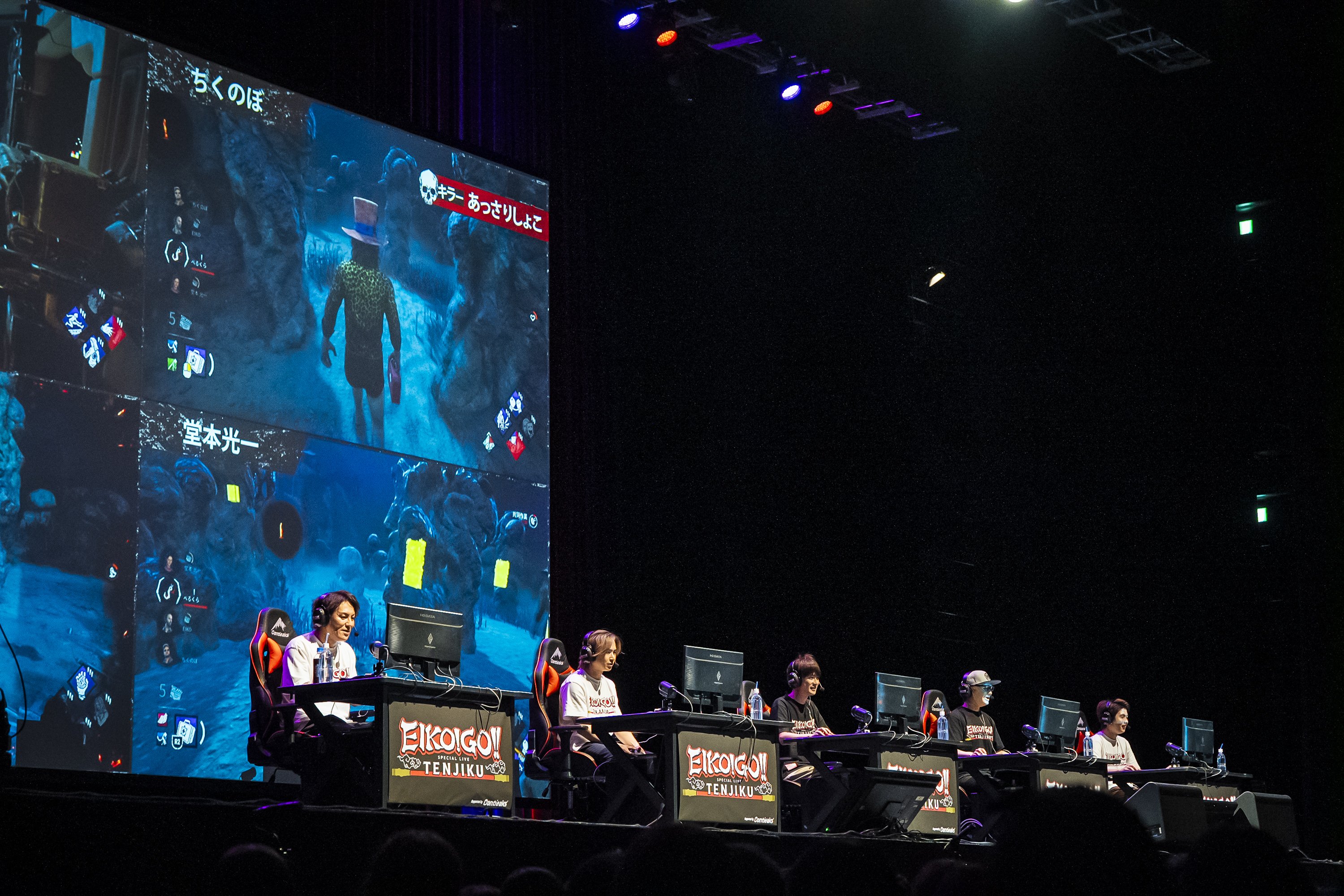 さらに、非対称型対戦アクションゲーム「Dead by Daylight」の生対決を実施。そこでは狩野が「僕にとっての師匠」と語る、あっさりしょこ、柏木べるくら、ちくのぼ、という3人のゲーム実況者と一緒に対決を行うことになったが、そこに"超サプライズゲスト"として堂本光一の参戦が発表されると、会場からは悲鳴にも似た、割れんばかりの大歓声がわき起こる。
